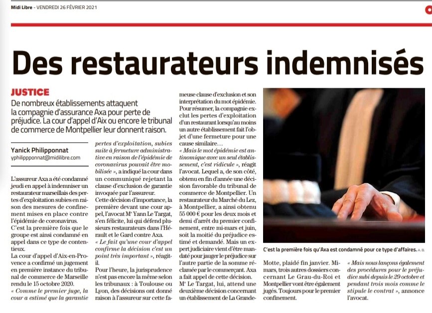 Me Le Targat a eu gain de cause pour son client, un restaurateur de la Grande-Motte qui gagne contre la compagnie d'assurances Axa !